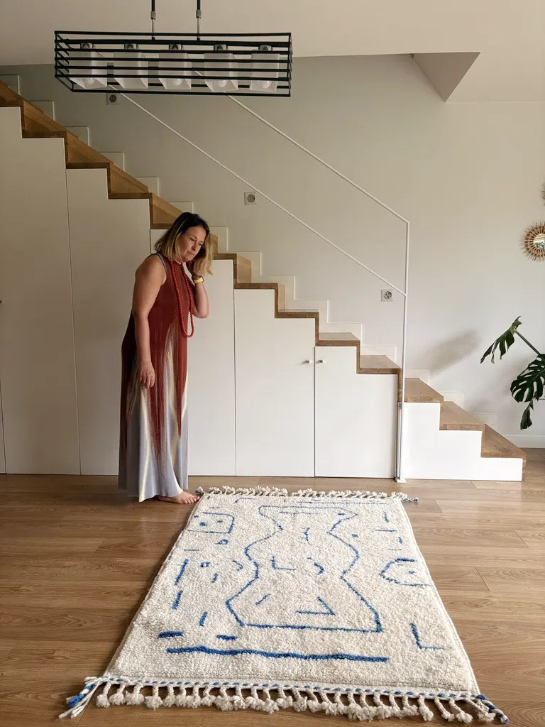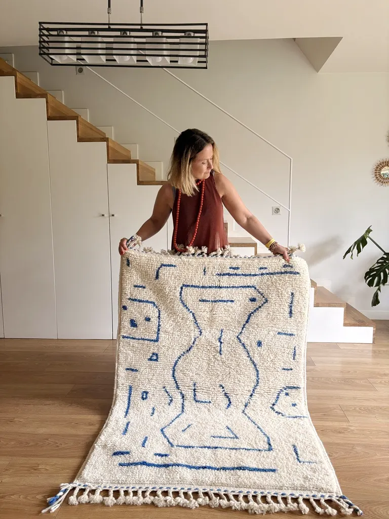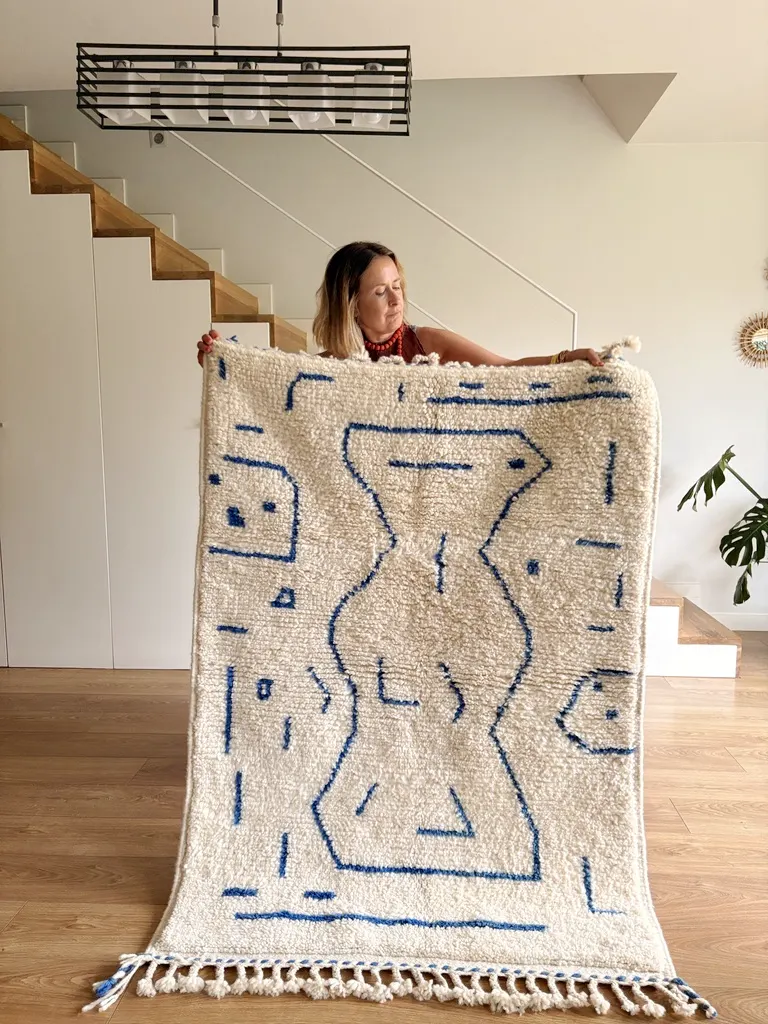 Nadir es una alfombra bereber de lana tipo Beni Ouarain tejida a mano sobre fondo blanco natural. Presenta un diseño compuesto por una figura central de líneas curvas en azul medio.