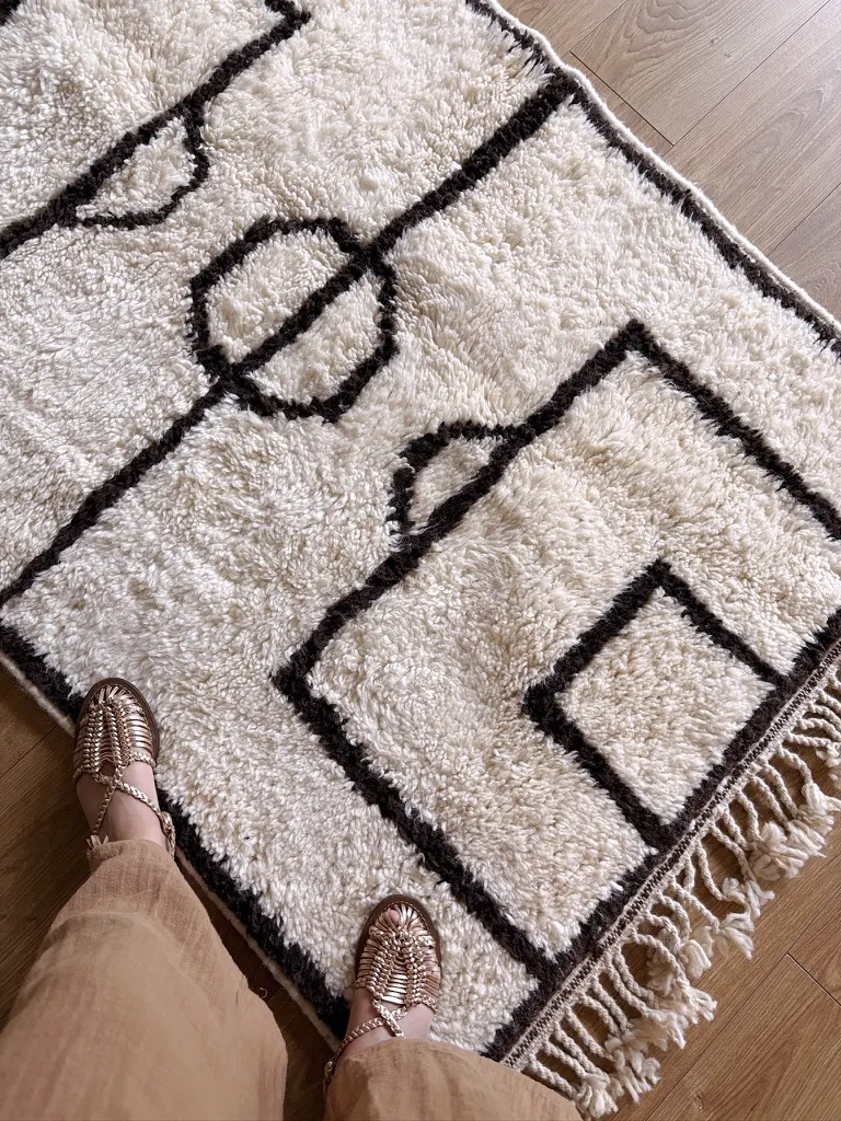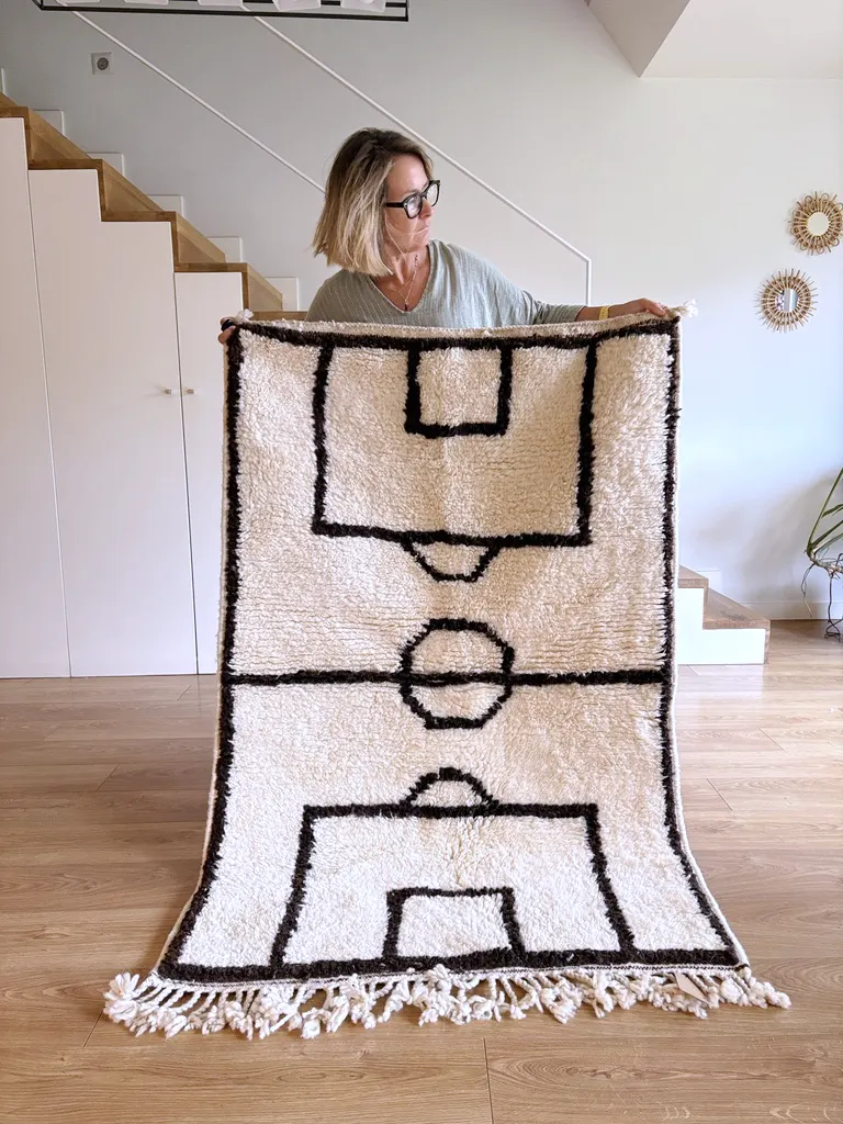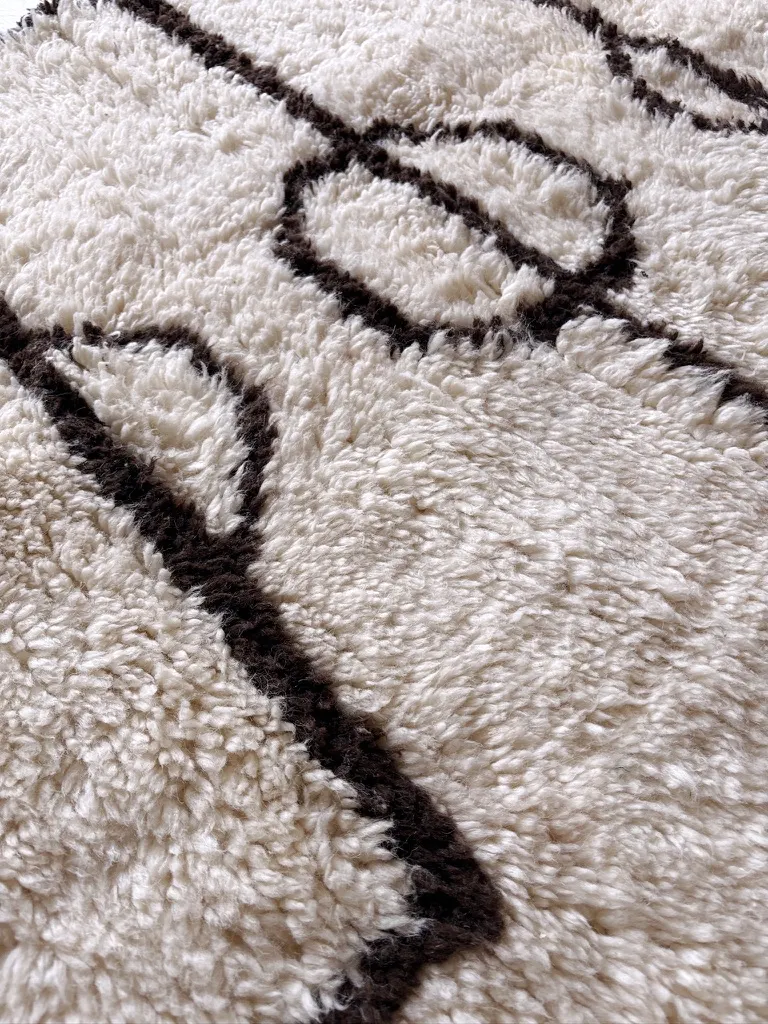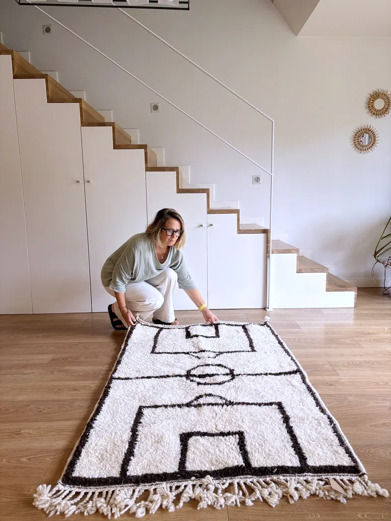 Marco es una divertida y original alfombra bereber infantil tipo Beni Ouarain, que ha sido tejida a mano en lana natural por artesanas del Atlas.