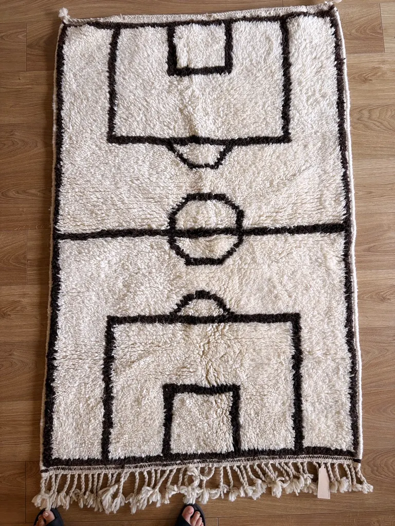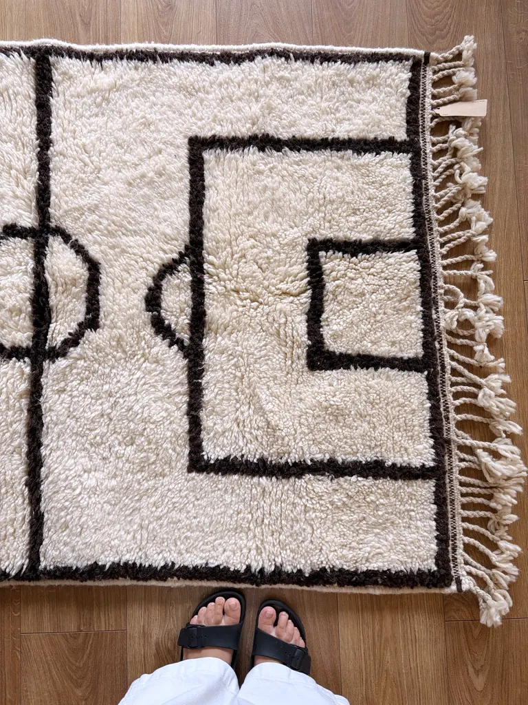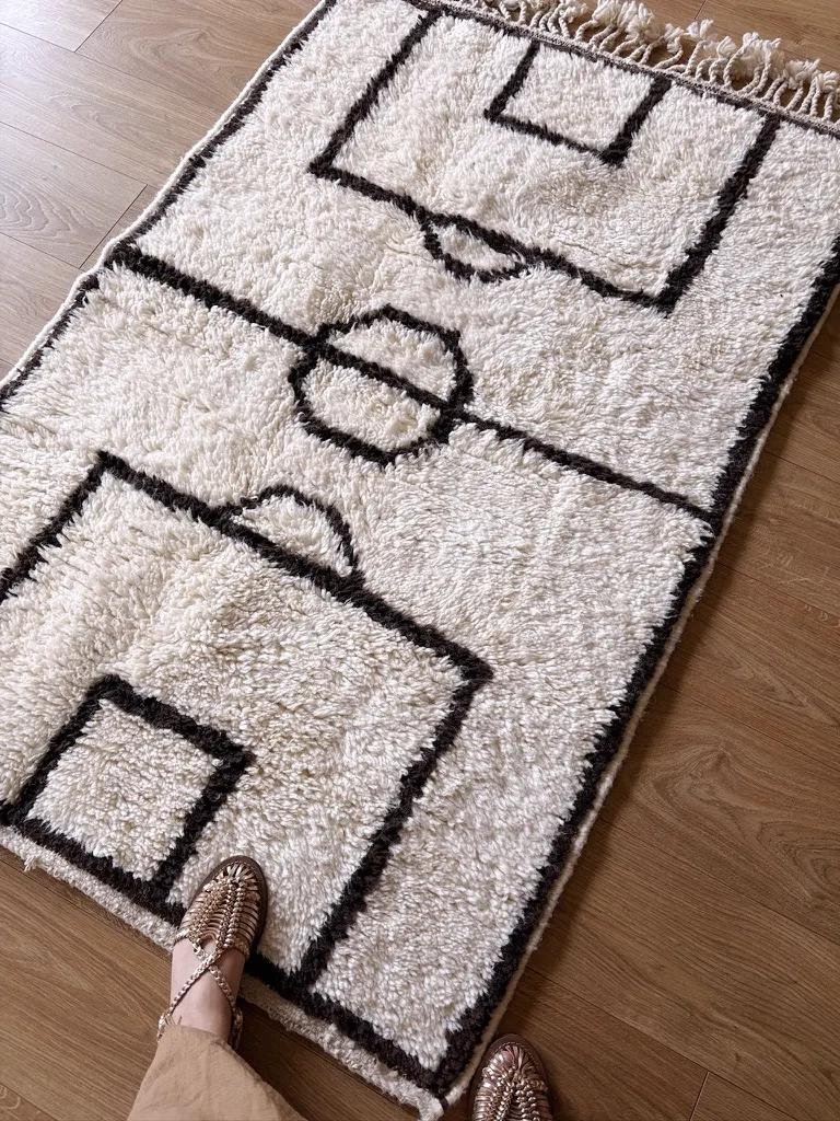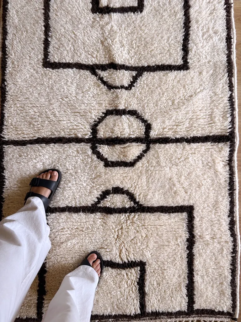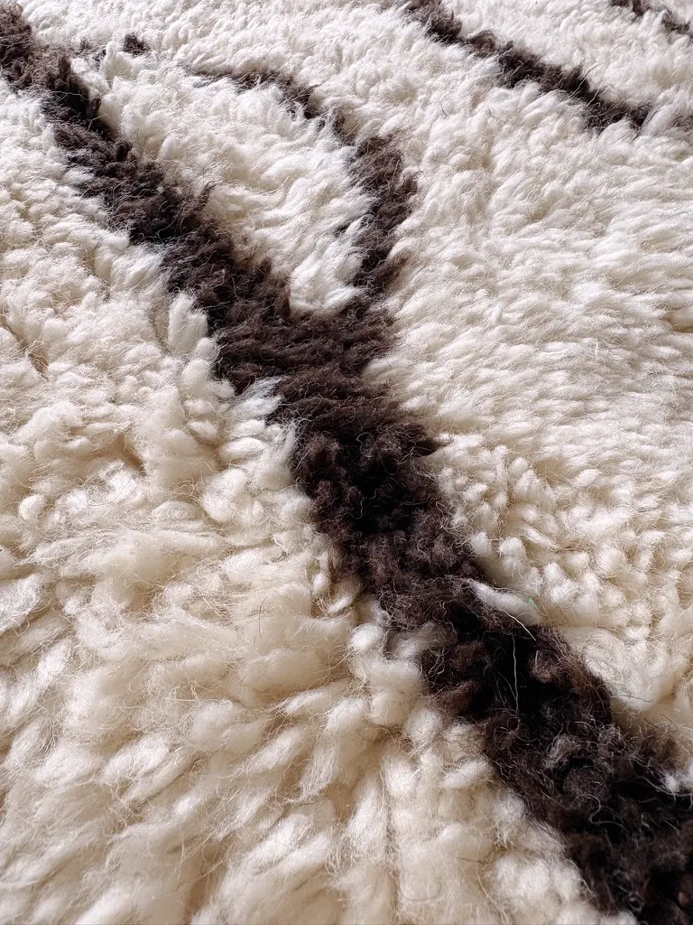Marco es una divertida y original alfombra bereber infantil tipo Beni Ouarain, que ha sido tejida a mano en lana natural por artesanas del Atlas.