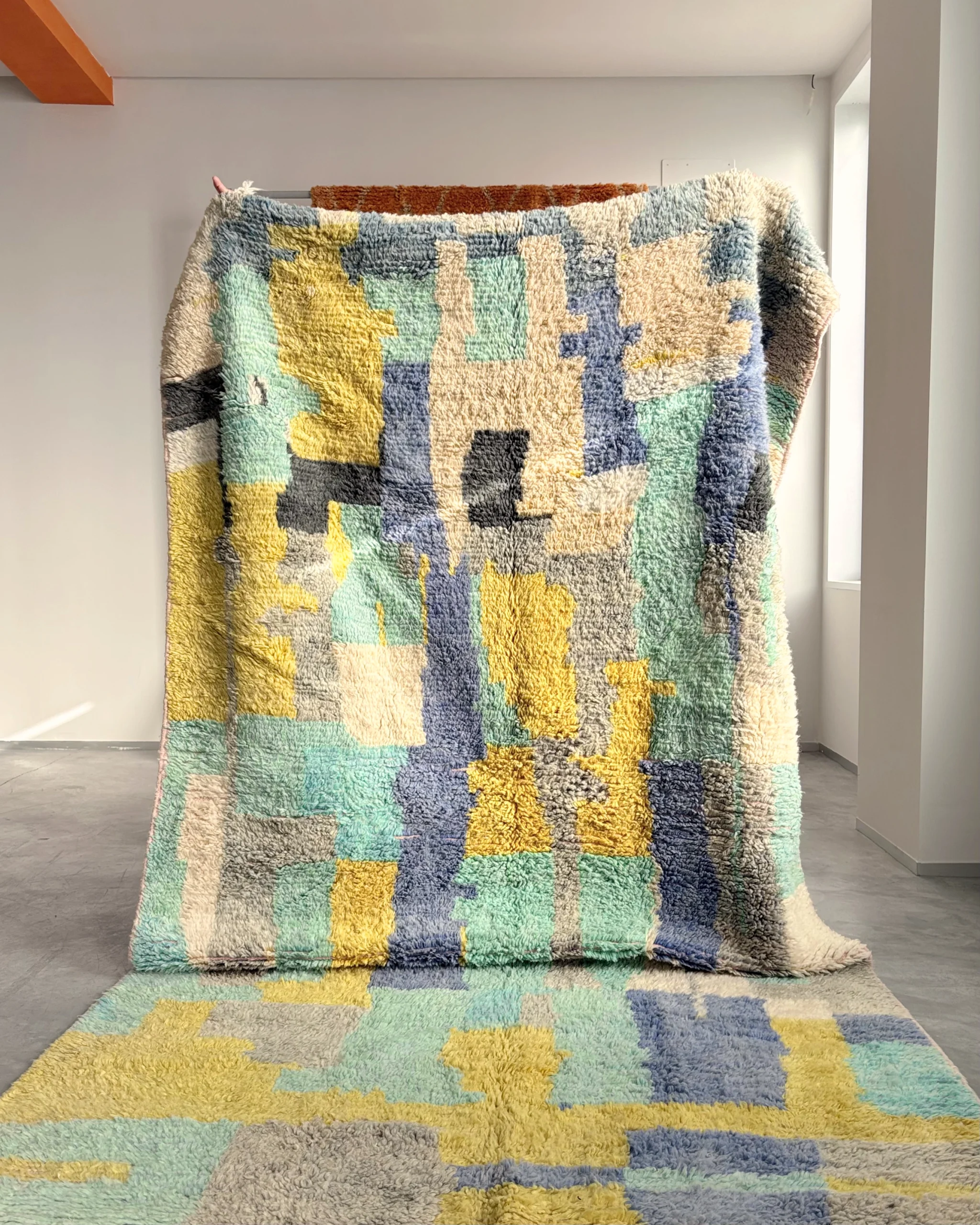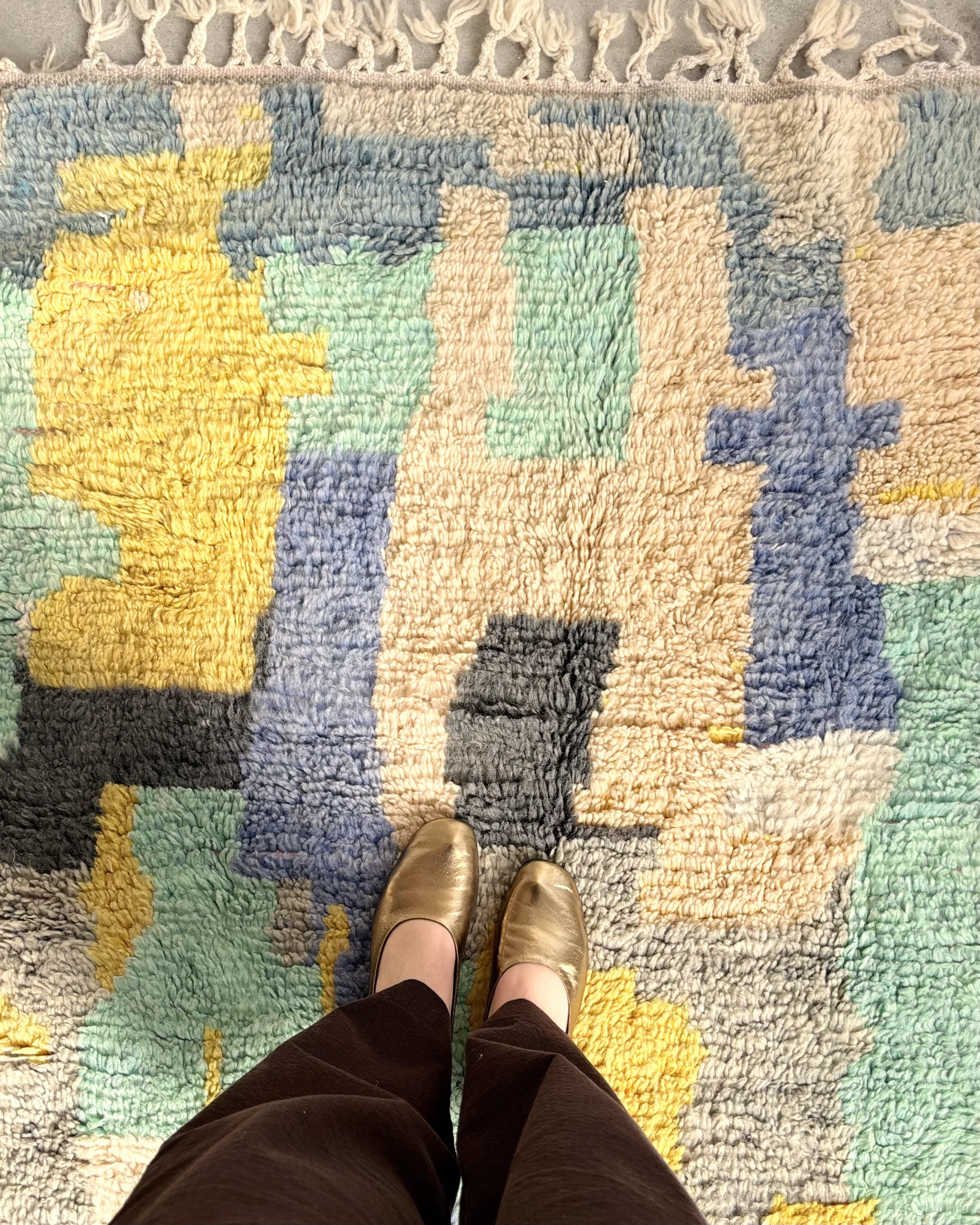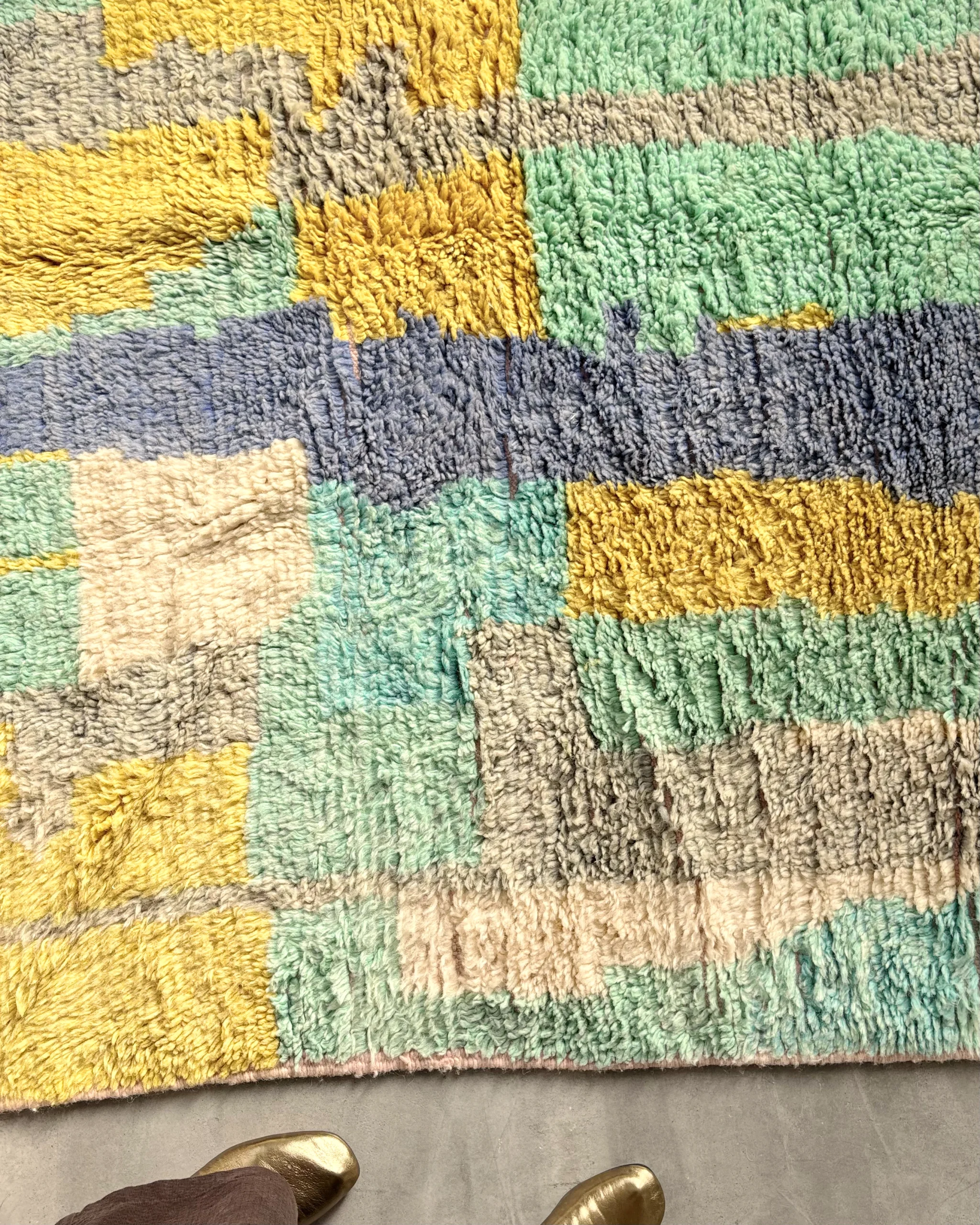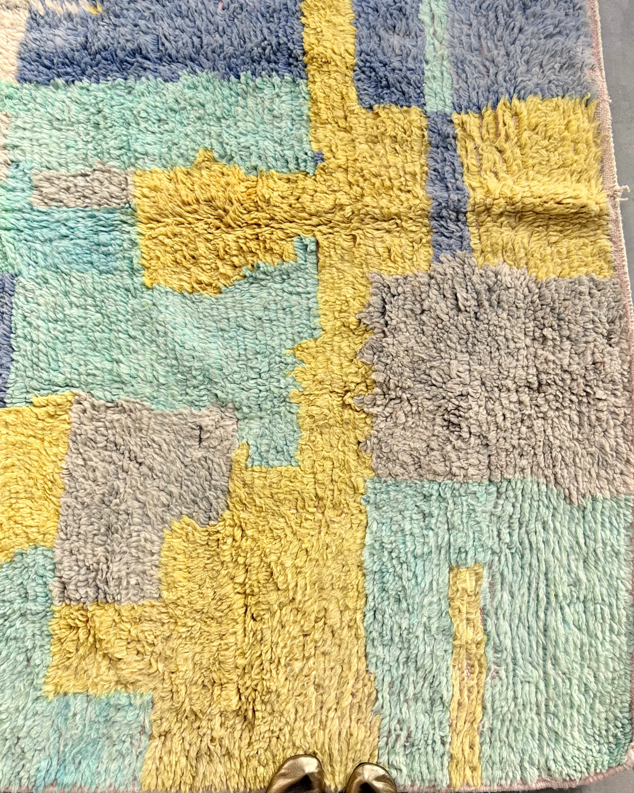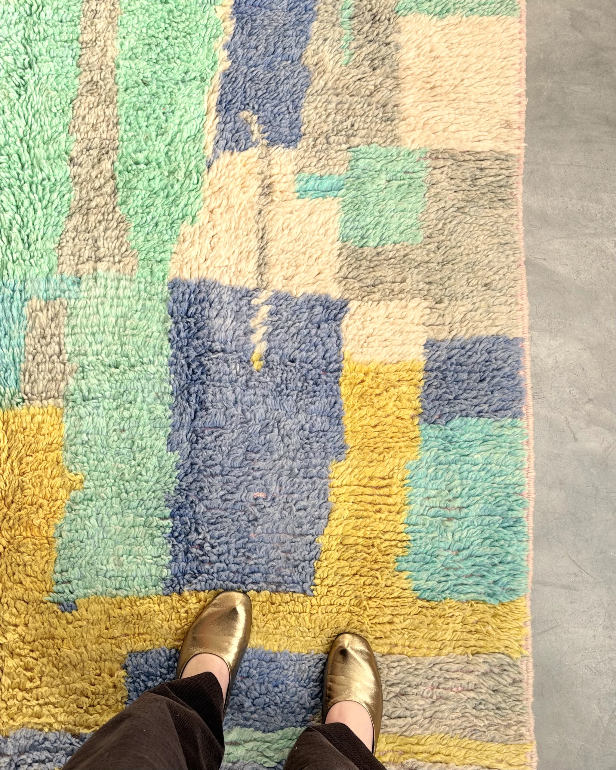 Alfombra boujaad azul Candy Clouds con bloques de color en tonos azul, verde, amarillo y gris, tejida a mano en Marruecos con lana natural.
