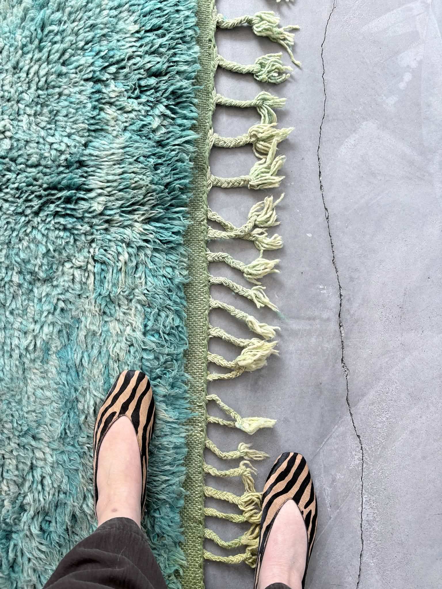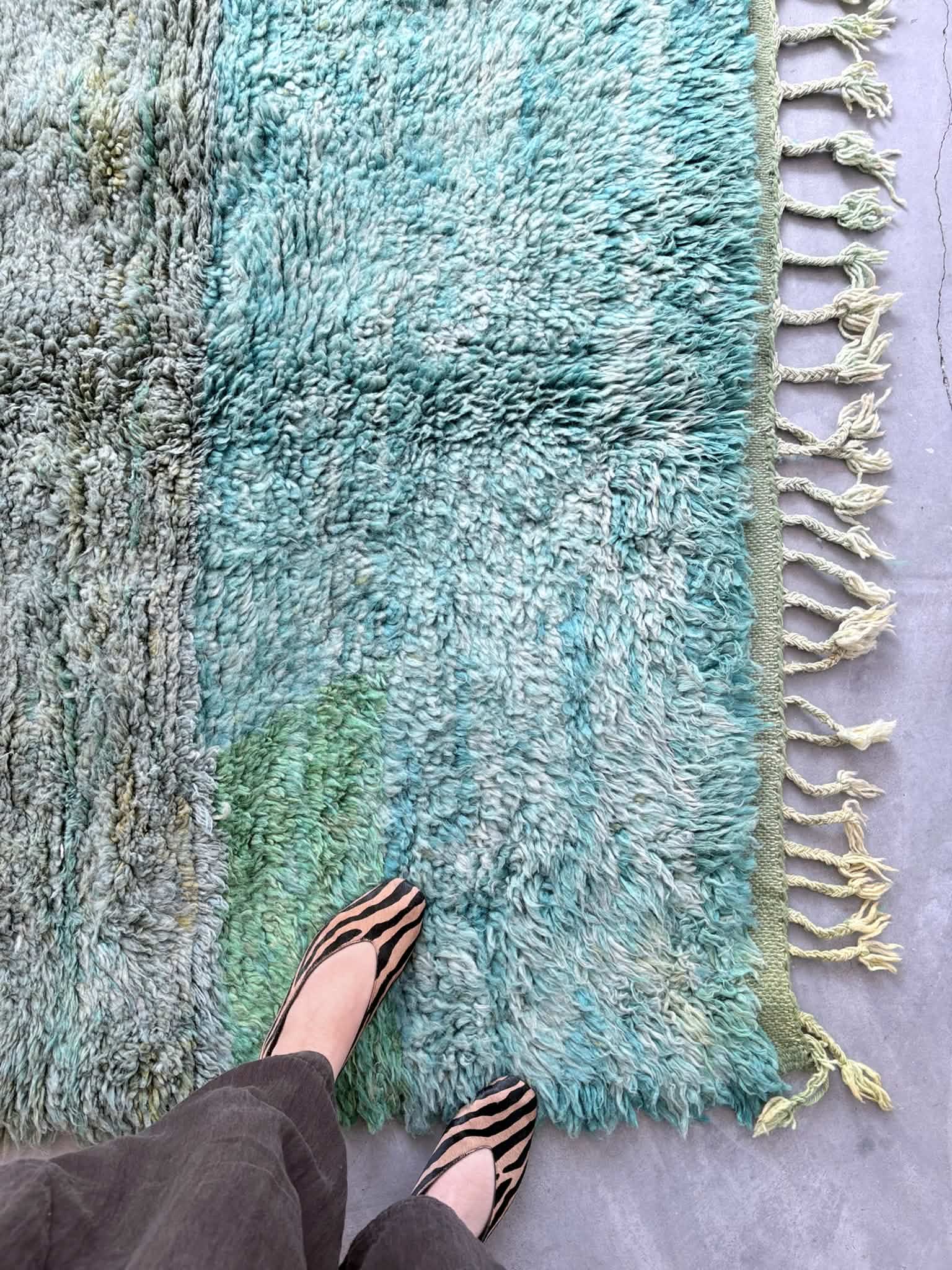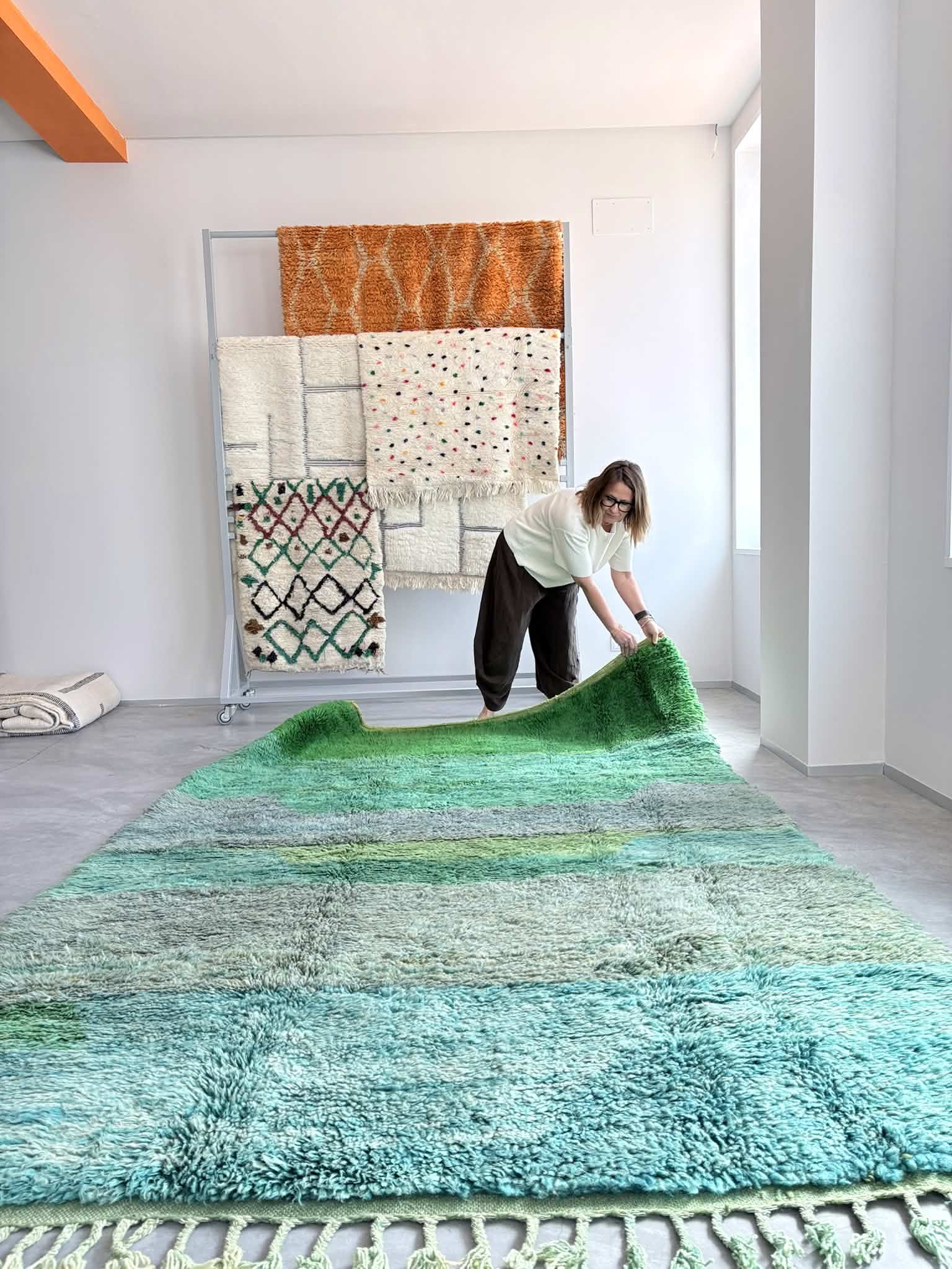 Green Jungle es una alfombra bereber tejida a mano en Marruecos con lana natural en tonos verdes y turquesas. Una mezcla entre Mguild y Boujaad que destaca por su presencia visual y por cómo trabaja la gama de colores, con un acabado cálido y muy agradable al tacto.