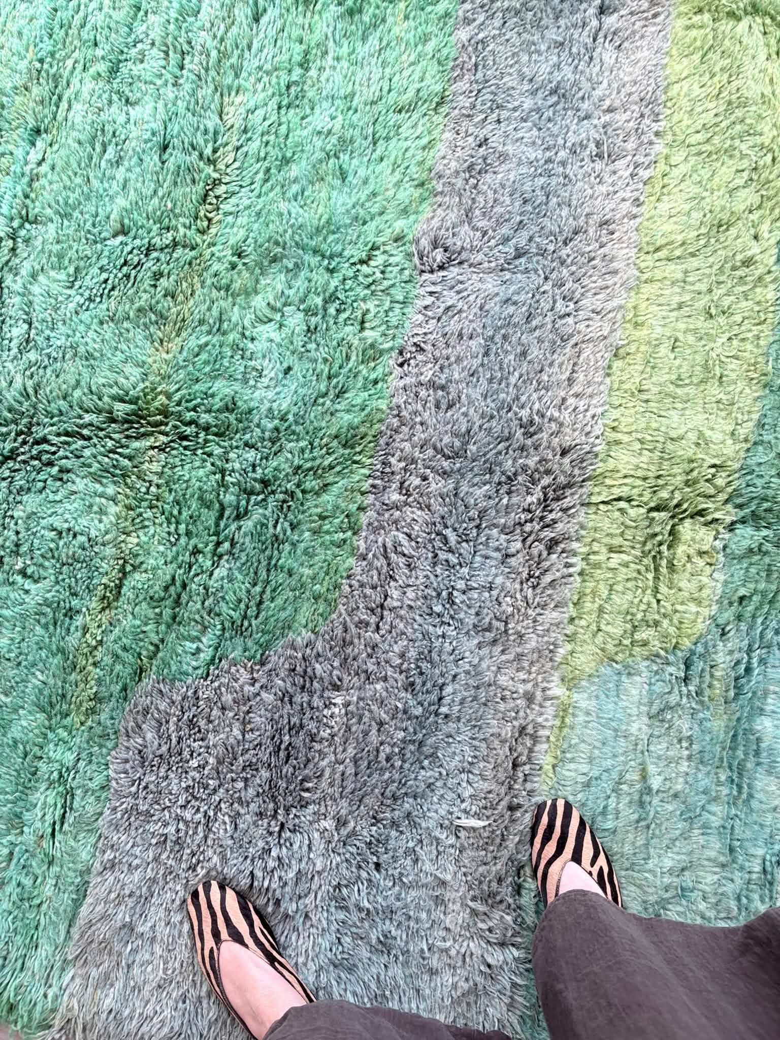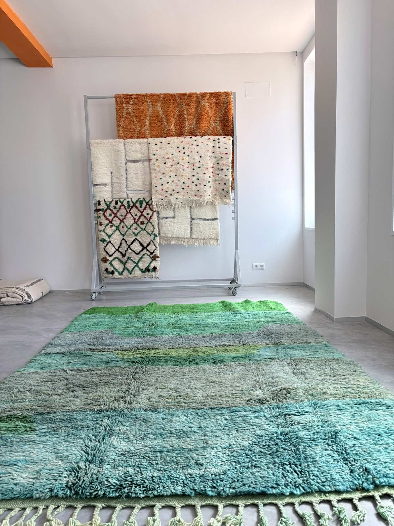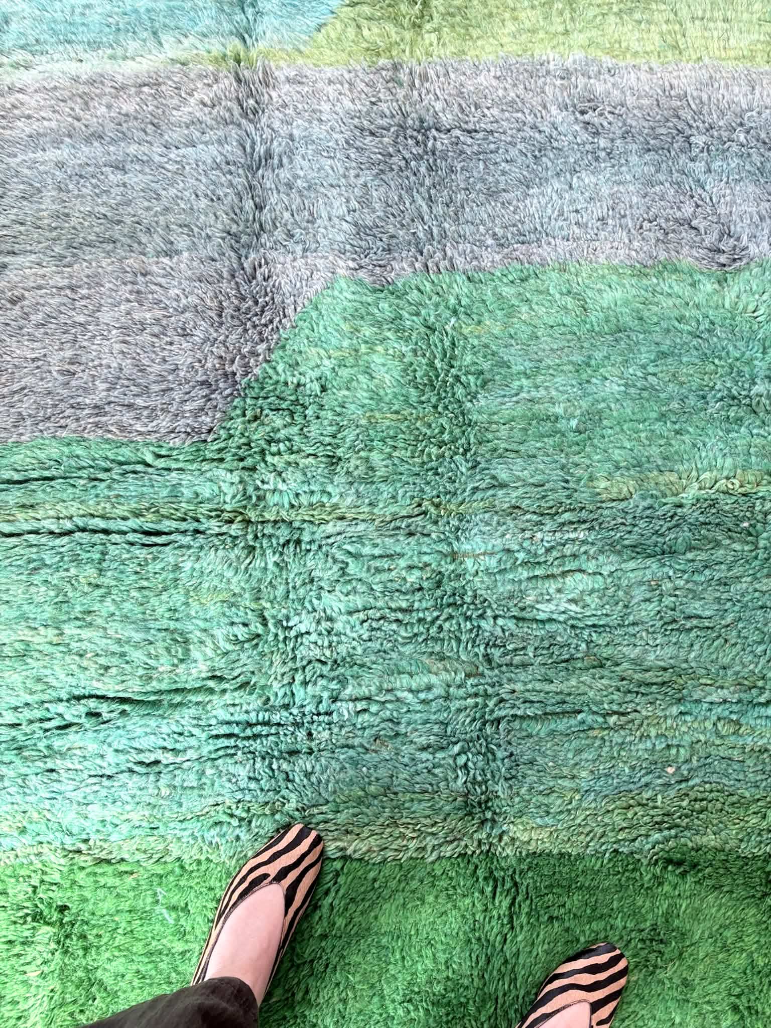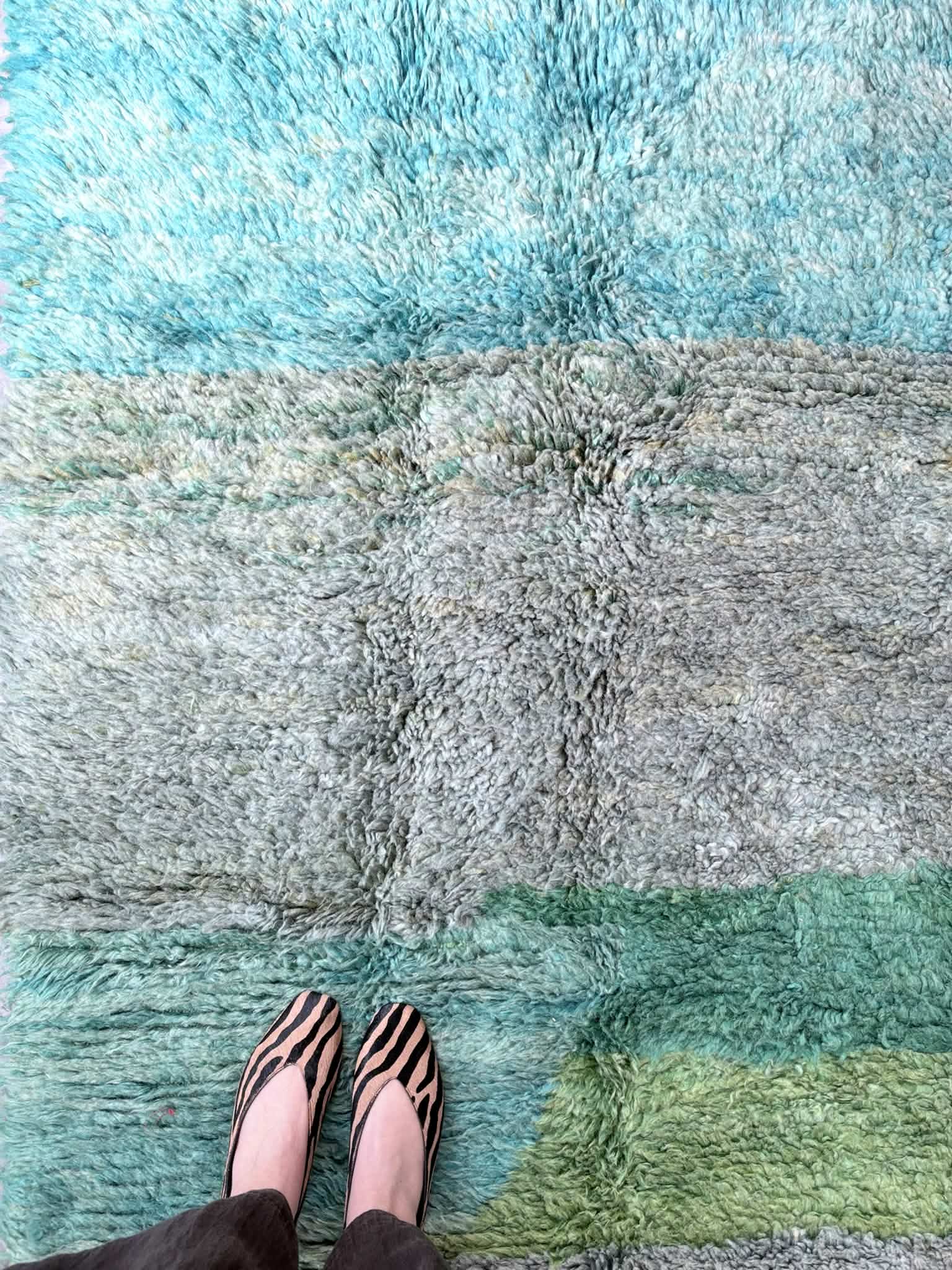 Green Jungle es una alfombra bereber tejida a mano en Marruecos con lana natural en tonos verdes y turquesas. Una mezcla entre Mguild y Boujaad que destaca por su presencia visual y por cómo trabaja la gama de colores, con un acabado cálido y muy agradable al tacto.