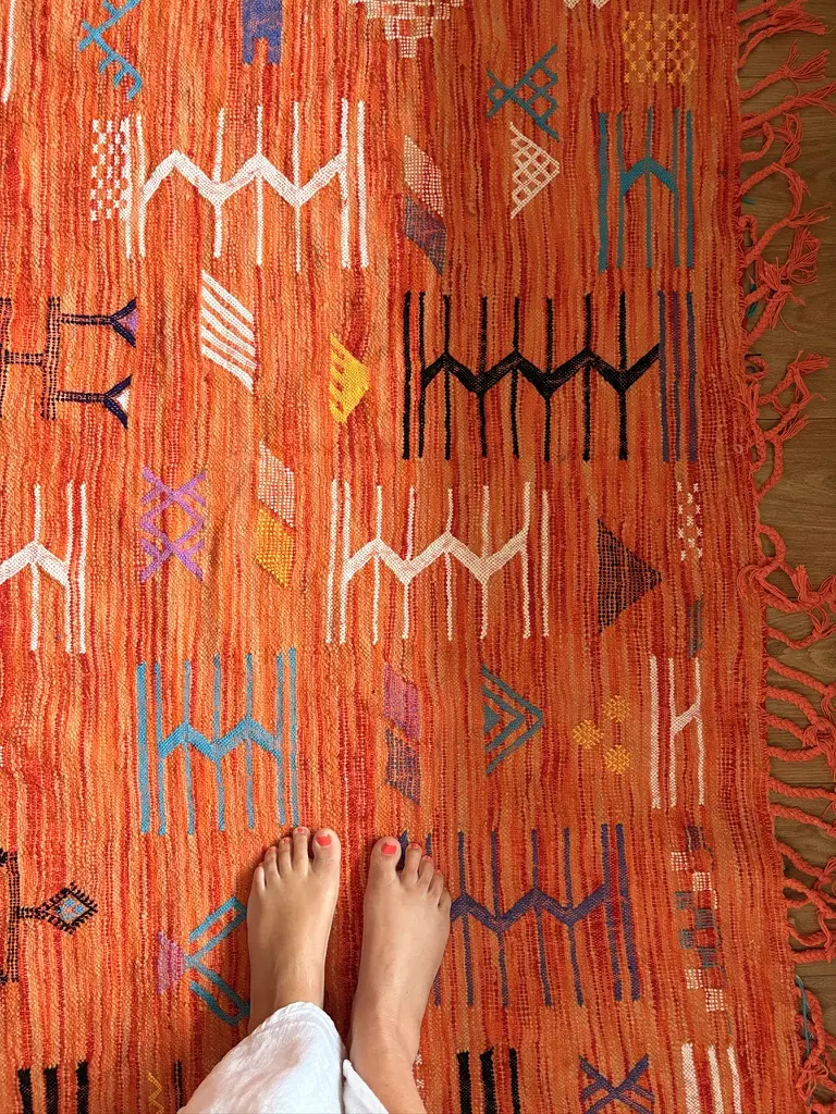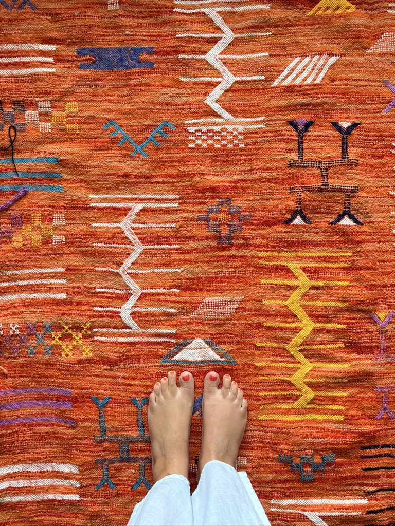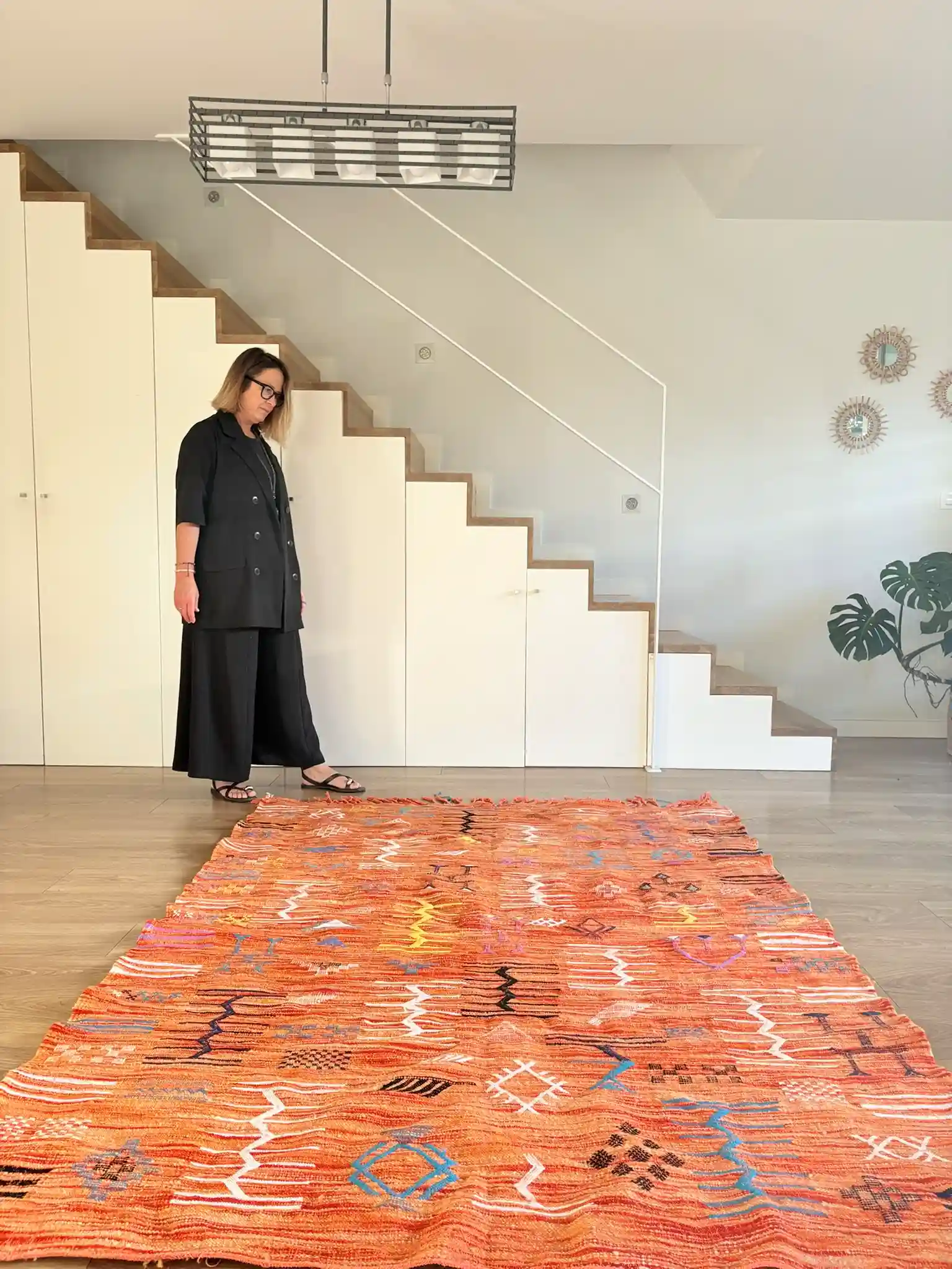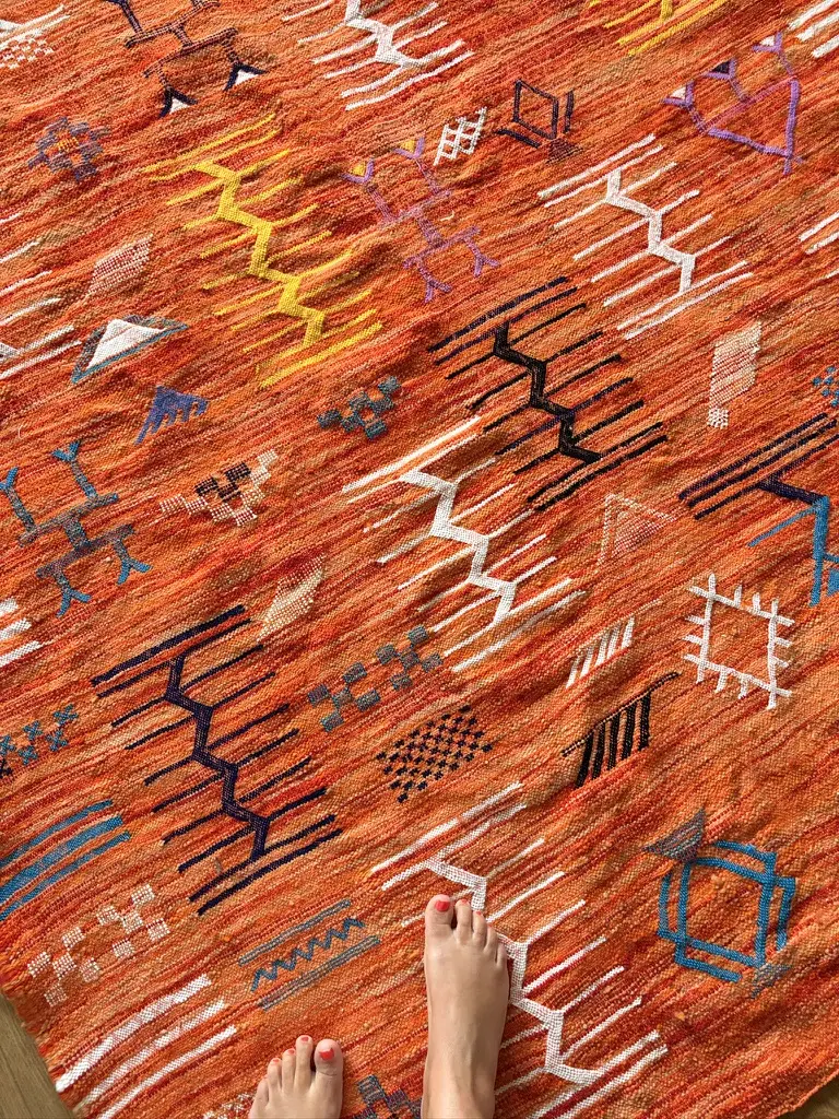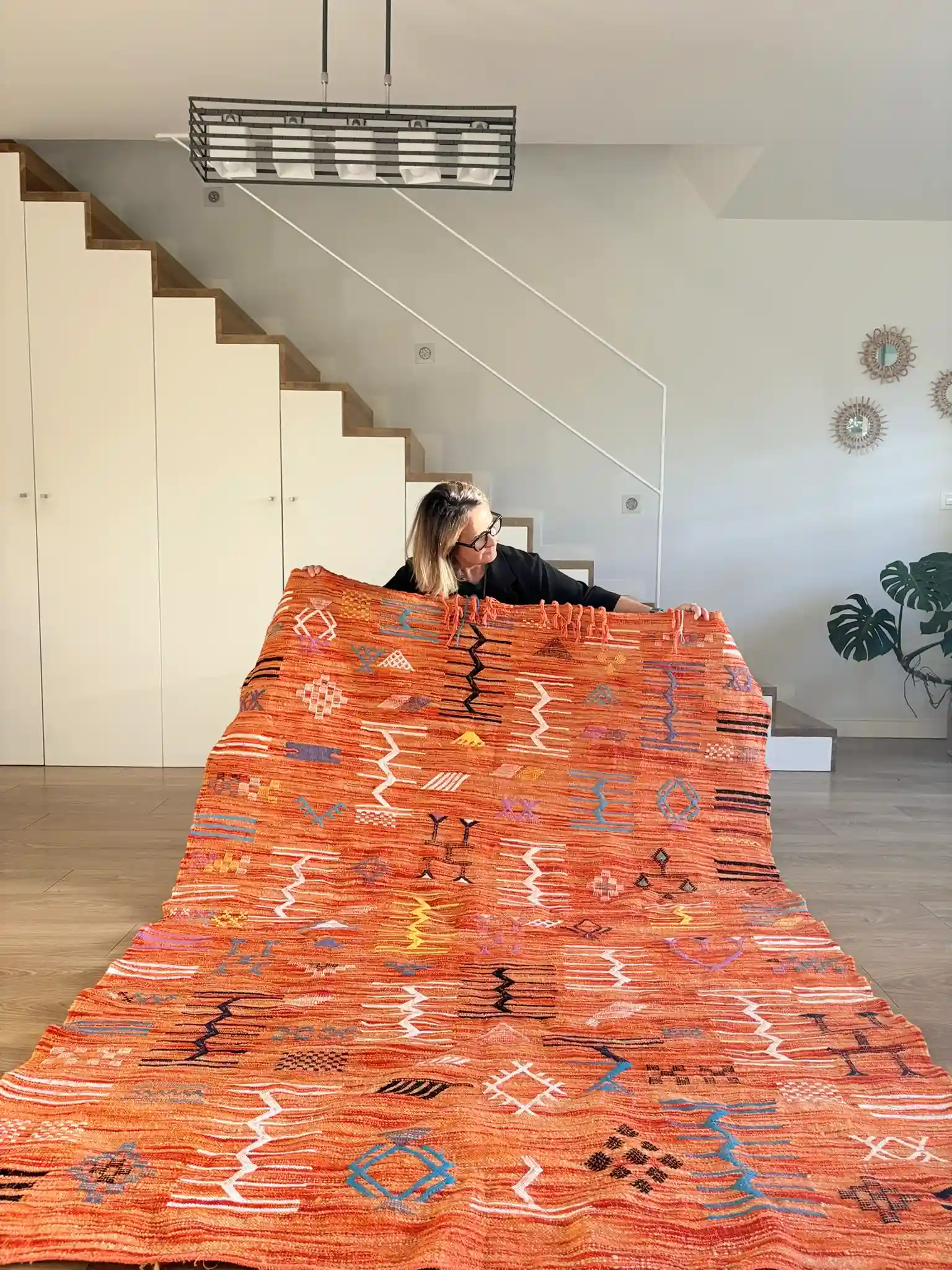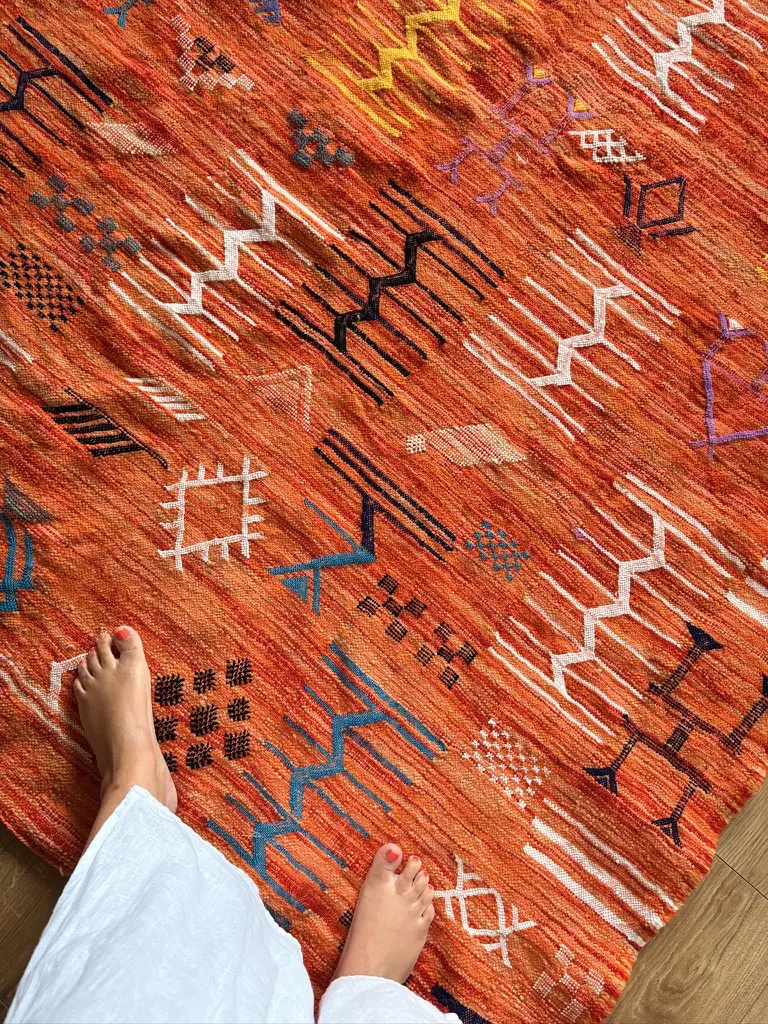 Zahara es una alfombra tipo kilim tejida a mano en tonos cálidos de naranja, con motivos étnicos en otros colores, como amarillo, turquesa, negro y blanco. Su diseño con símbolos bereberes es muy característico pero único a la vez.