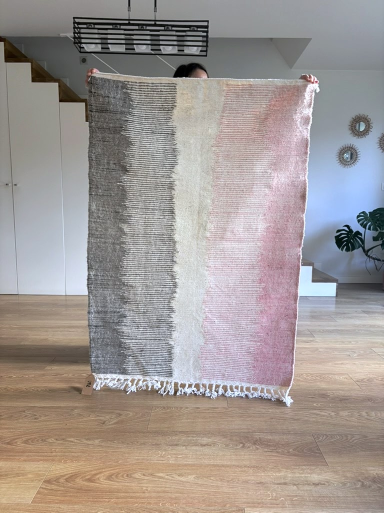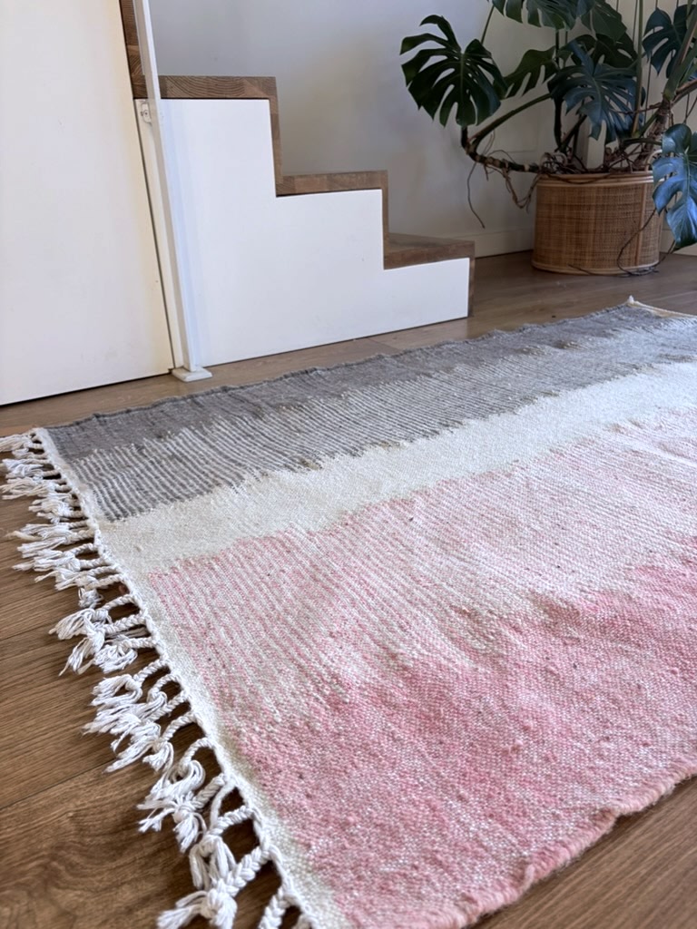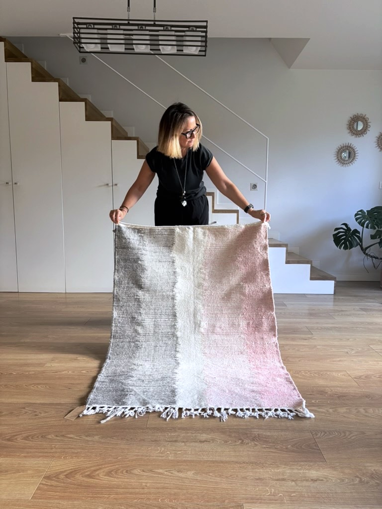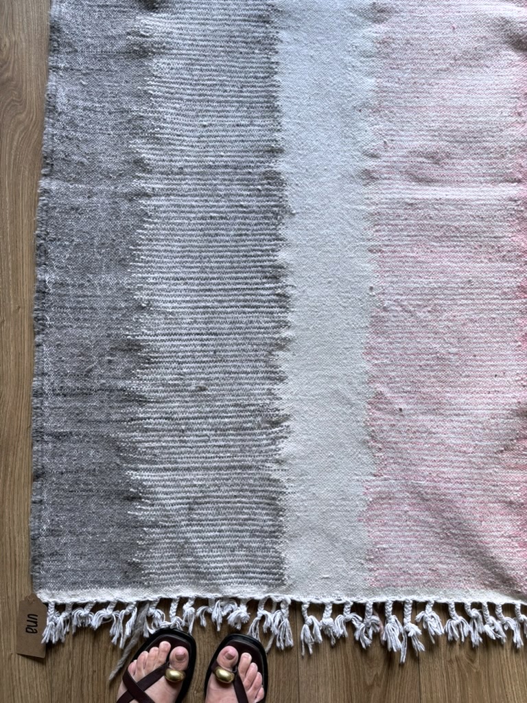 Una ha sido tejida a mano en Marruecos con lana natural siguiendo la tradición textil del Atlas. Su diseño tipo kilim, ligero y reversible, combina una franja gris suave con otra en tono rosa sobre fondo blanco.