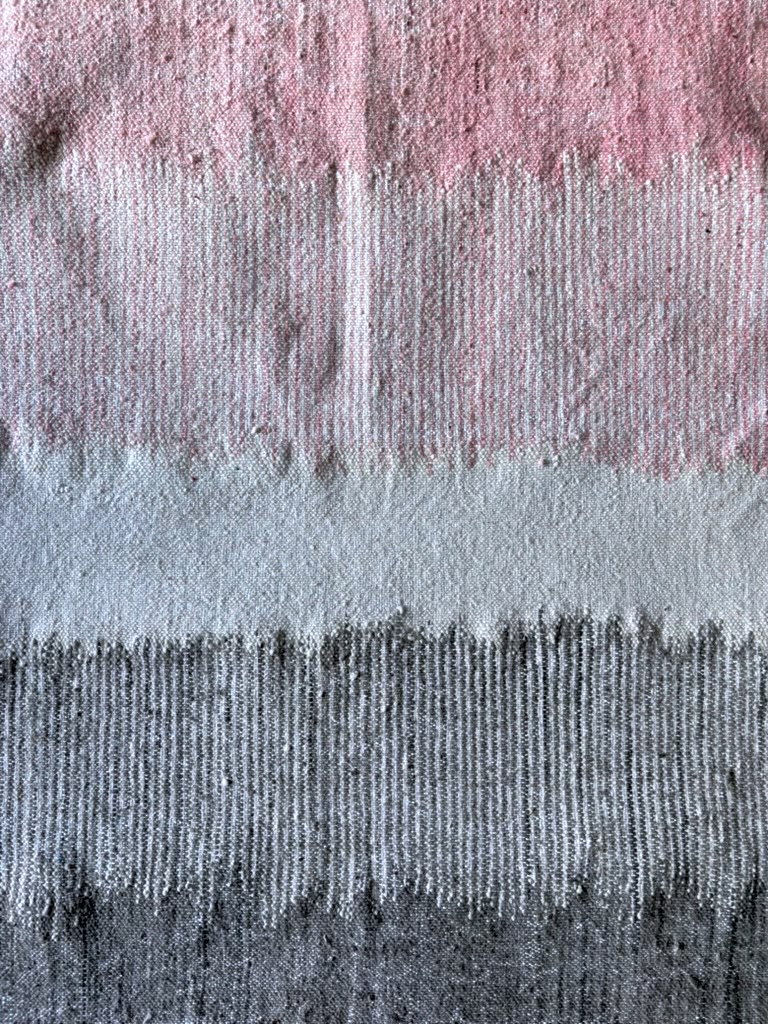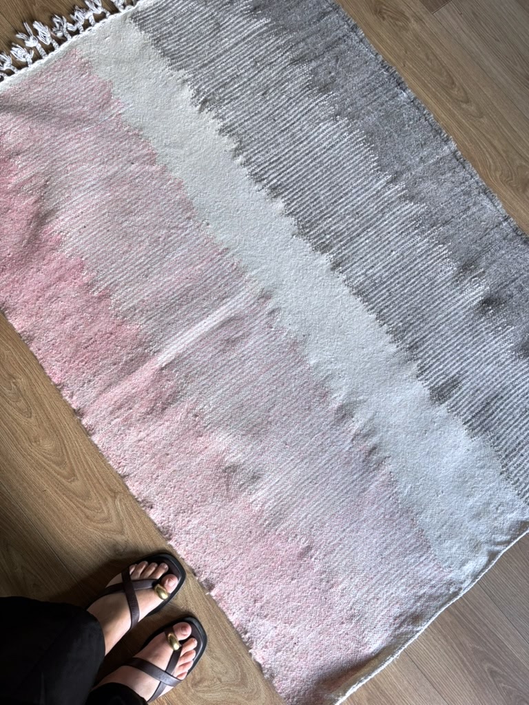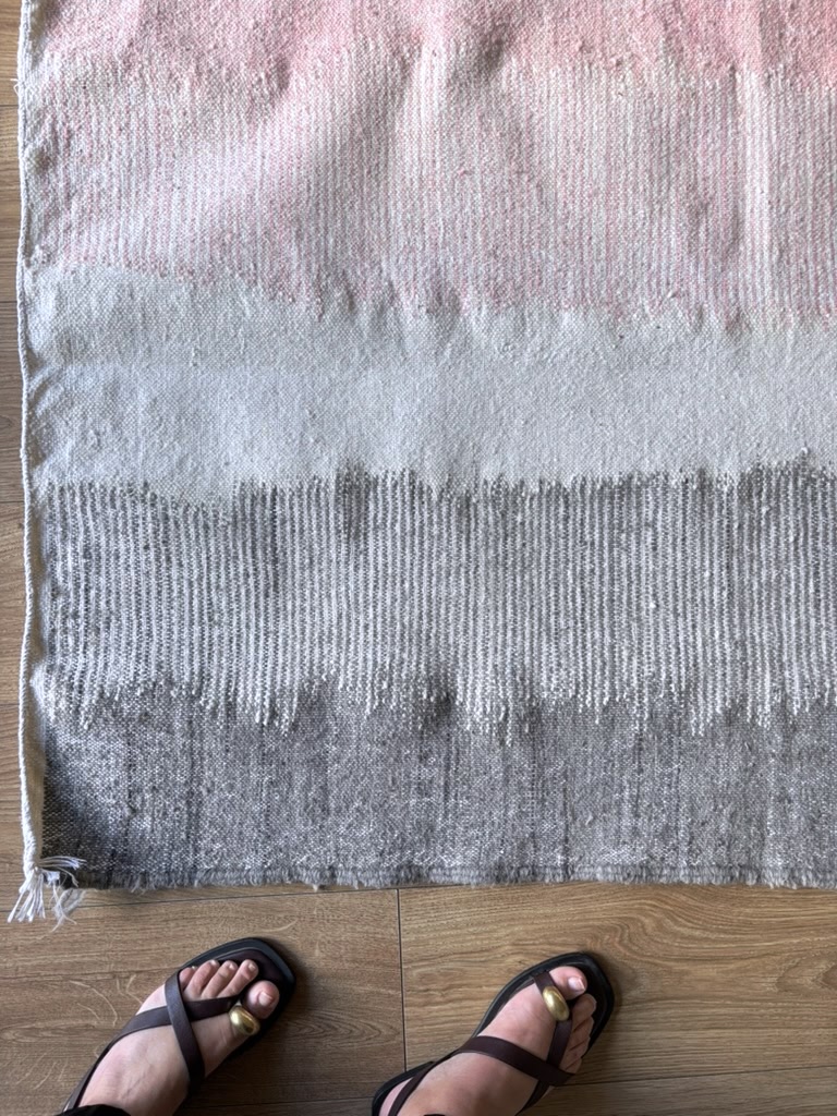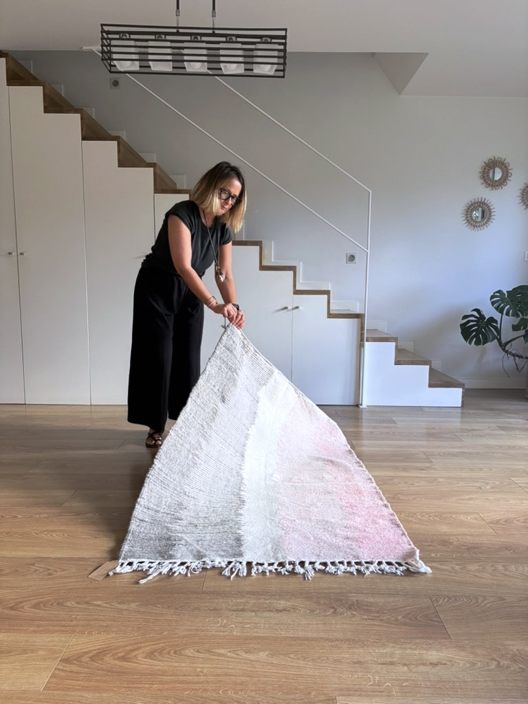 Una ha sido tejida a mano en Marruecos con lana natural siguiendo la tradición textil del Atlas. Su diseño tipo kilim, ligero y reversible, combina una franja gris suave con otra en tono rosa sobre fondo blanco.
