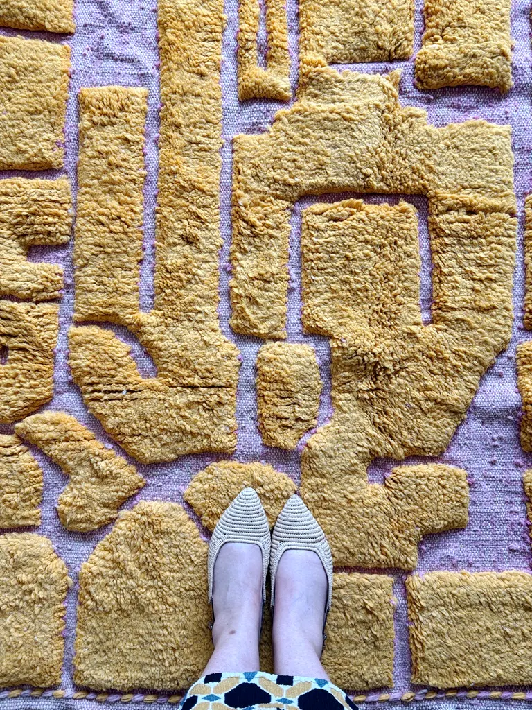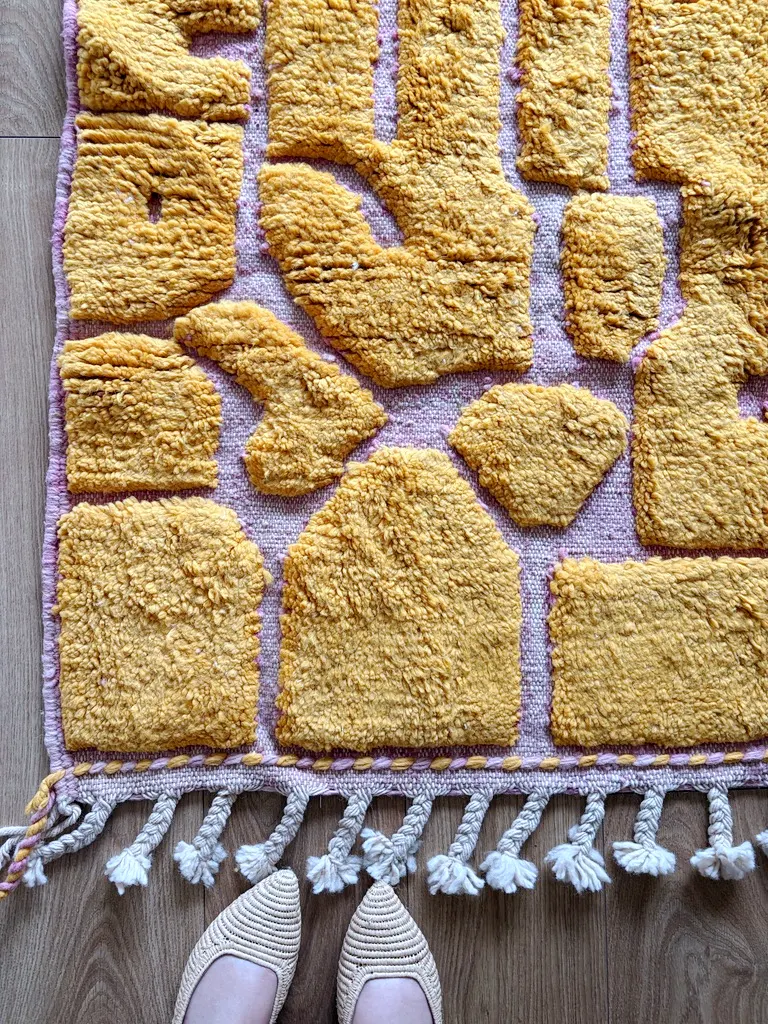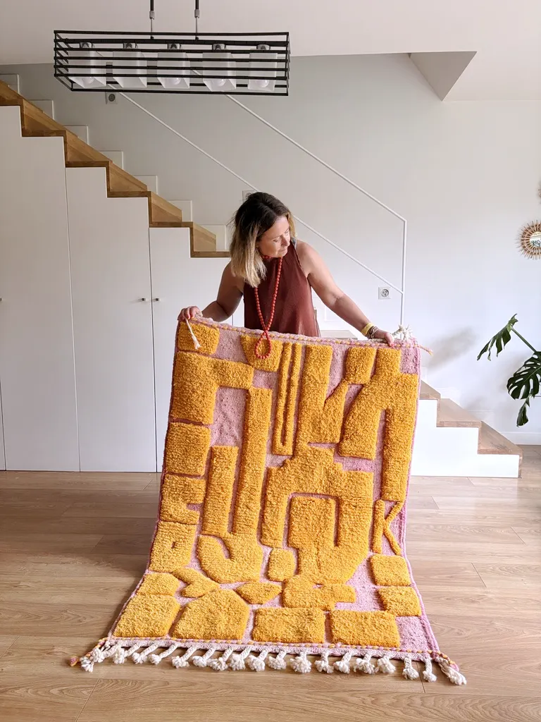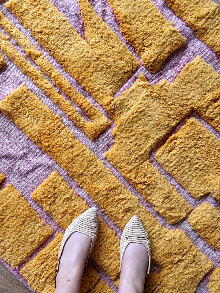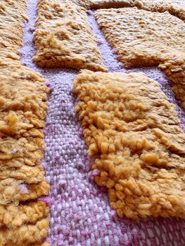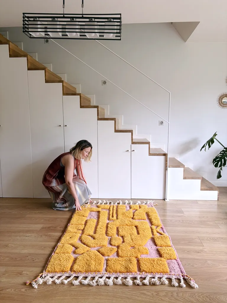 ¿Puedes imaginarte una alfombra más divertida? Faïza es una llamativa alfombra bereber de lana con fondo rosa y diseño de bloques en relieve en amarillo mostaza. Una mezcla explosiva y muy original!
