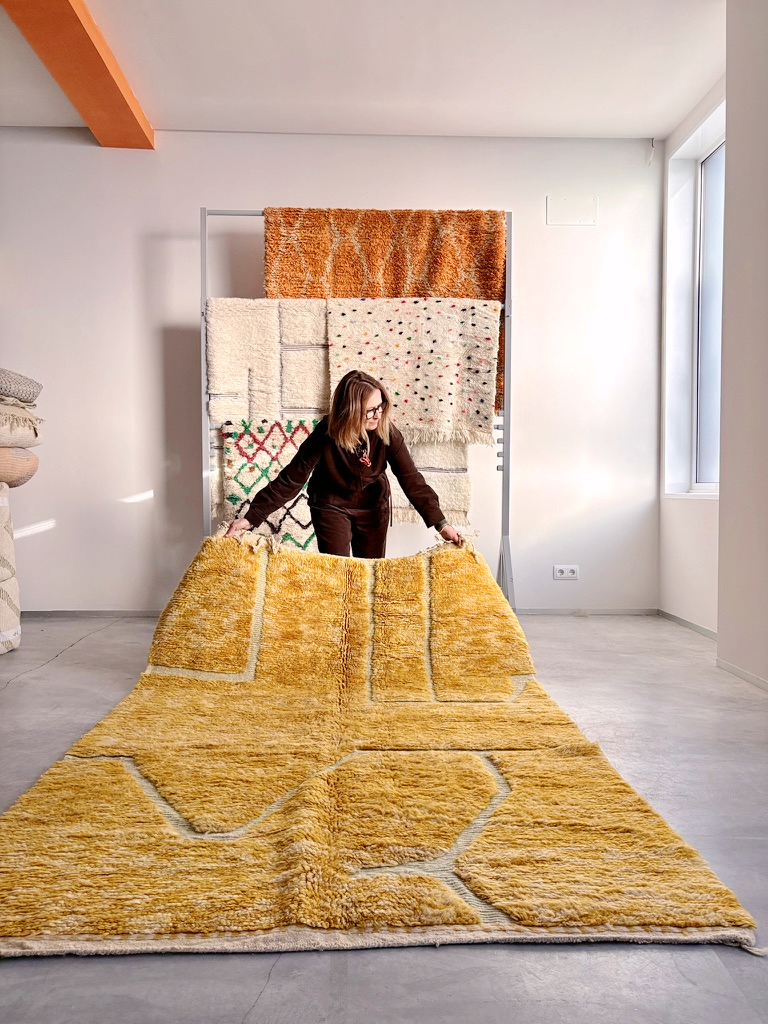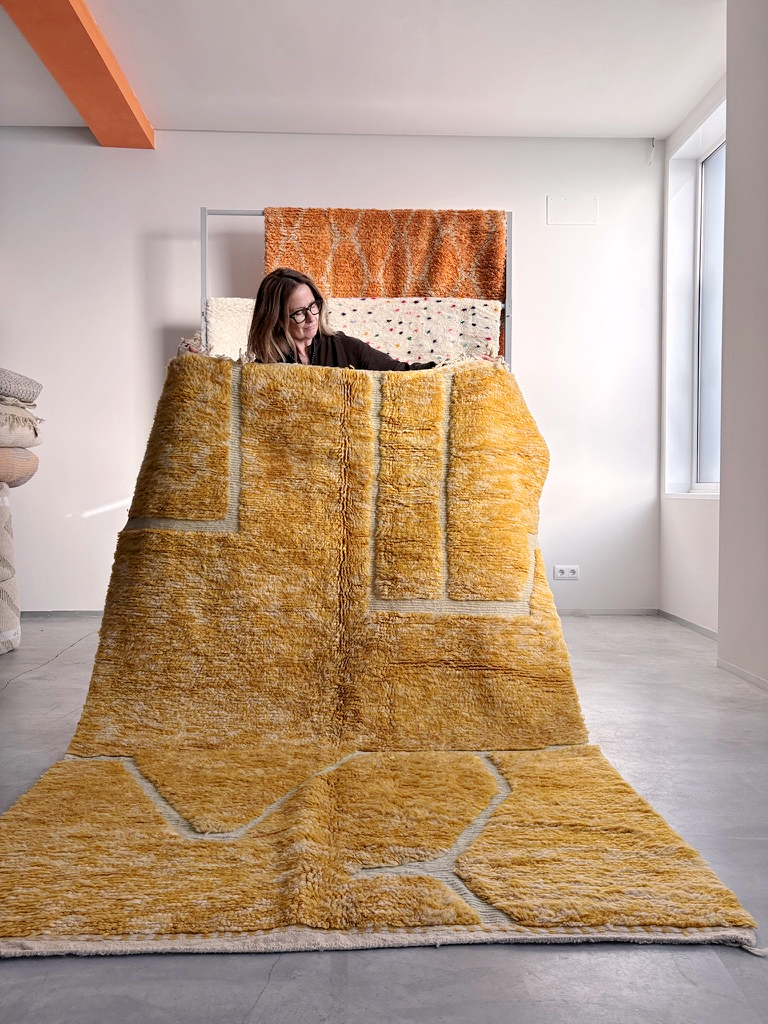 Todas nuestras alfombras bereber son piezas únicas, confeccionadas de forma artesanal con materiales naturales y cuidadosamente seleccionadas en los mismos talleres o cooperativas en las montañas del Atlas, Marruecos.