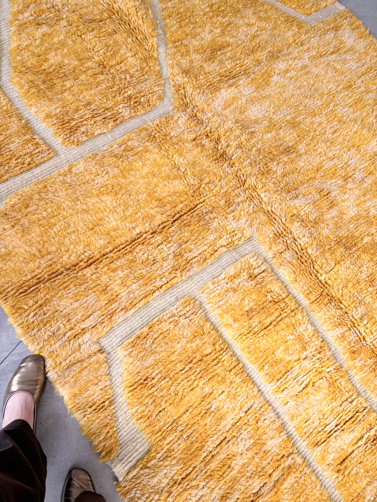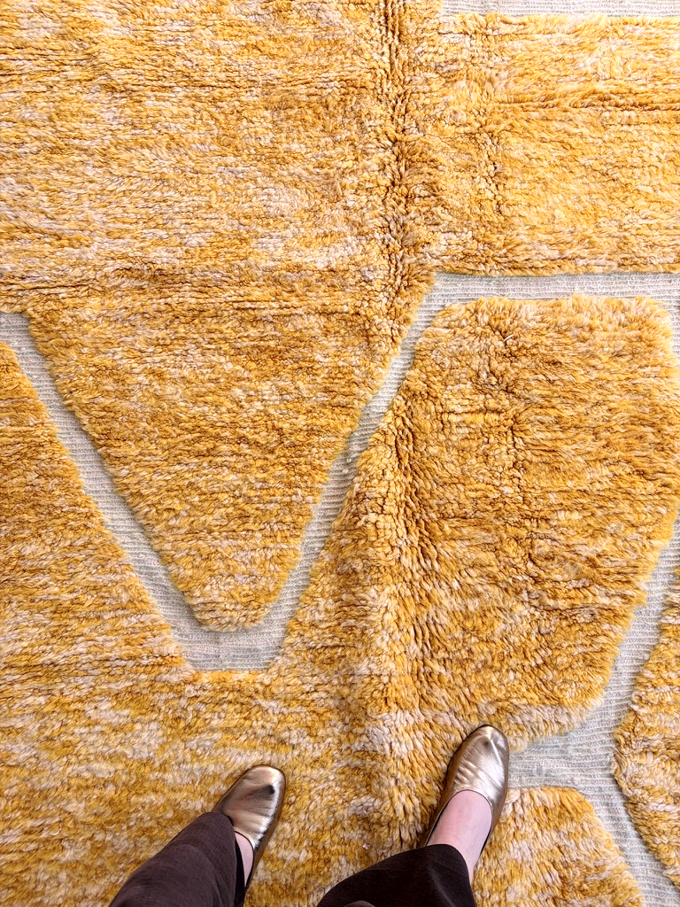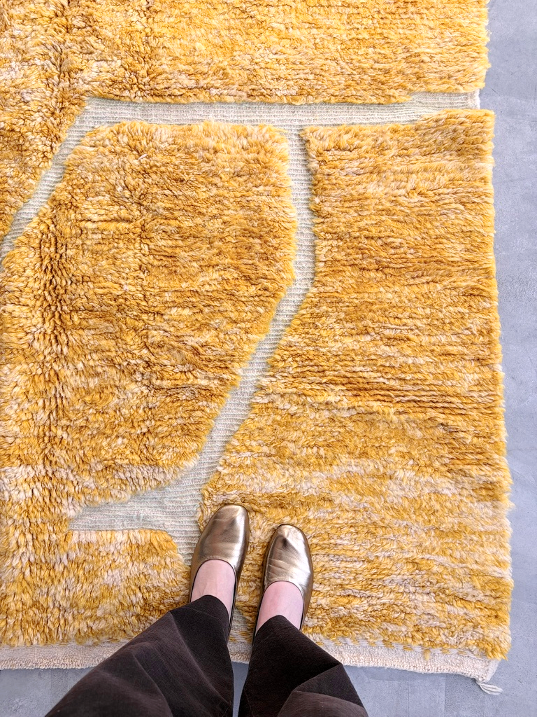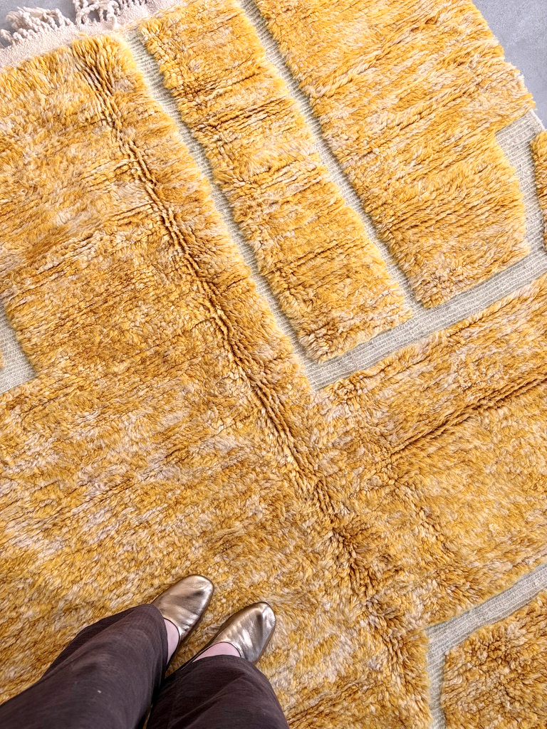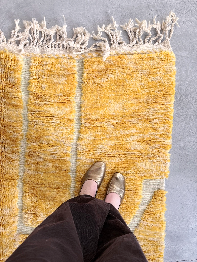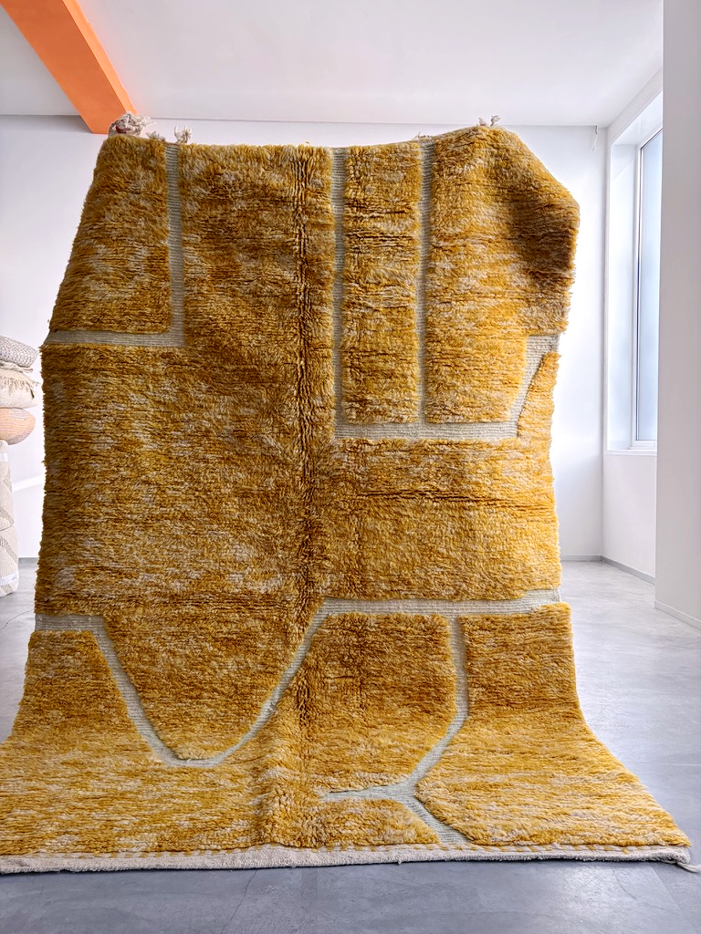 Esta alfombra Beni Ouarain está confeccionada con lana 100% natural en un vibrante tono mostaza que irradia calidez y personalidad. Su característica lana larga y mullida está recorrida por surcos creando un moderno diseño que le otorga una presencia visual atractiva y contemporánea. Los flecos naturales en uno de los extremos rematan una pieza de artesanía marroquí auténtica y única.