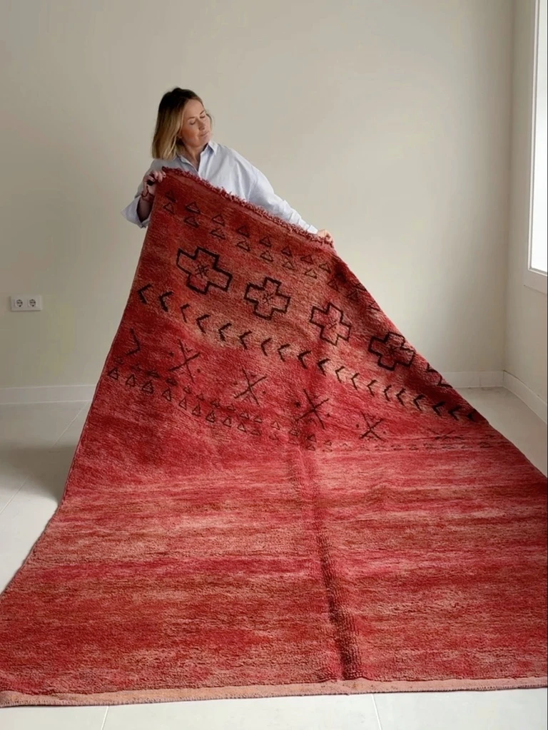 Maca es una alfombra vintage marroquí tejida a mano en lana gruesa, con un espectacular tono rojizo que varía en matices desde el óxido hasta el rubí. Tiene una pátina muy marcada, que hace que el color cambie según la luz y el ángulo de visión. En uno de los extremos, presenta motivos geométricos tradicionales en color oscuro, propios de las tribus del Atlas medio. Los flecos, muy cortos y discretos, están presentes solo en el borde decorado, siguiendo la técnica tradicional.