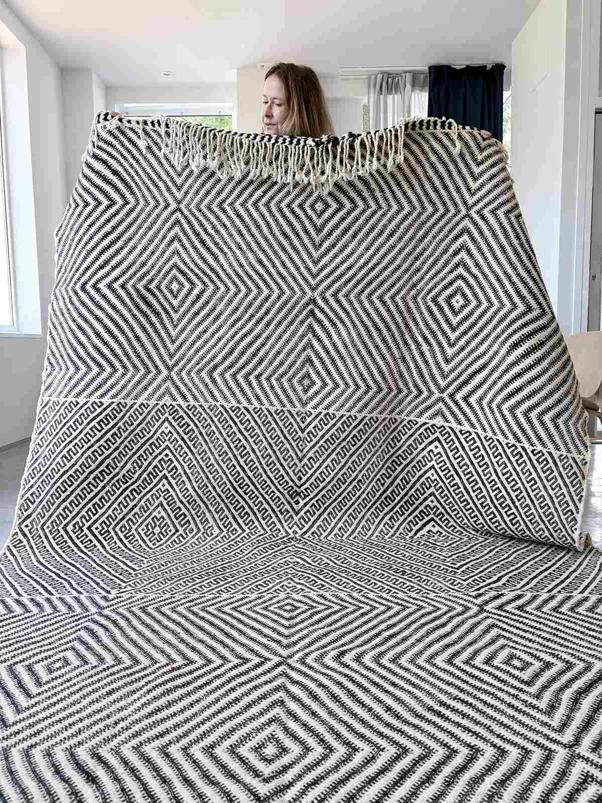 Puedes lavarla en casa con agua tibia abundante, jabón y cepillo suave y secarla al sol o, si lo prefieres, puedes llevarla a una tintorería especializada en alfombras artesanales para una limpieza profunda cada cierto tiempo.